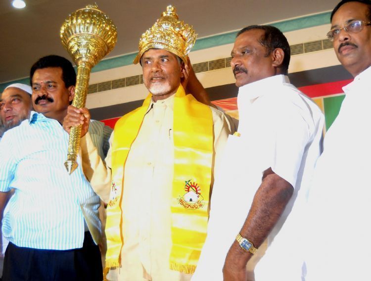 TDP president Chandrababu Naidu presented with a mace and crown at party workers meeting in Nellore on Wednesday.