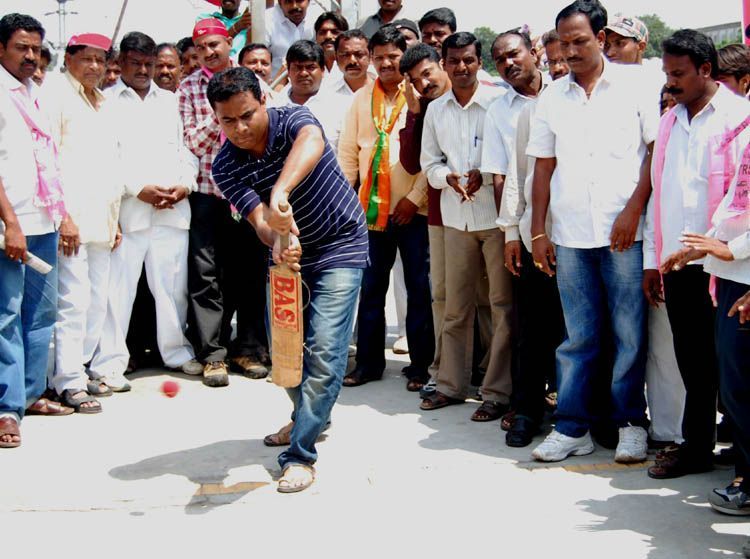 TRS MLA KT Rama Rao playing cricket on a railway platform with others supporters of Telangana on the second day of Rail Roko agitation at Moulali Railway Station here on Sunday -- INN Photos