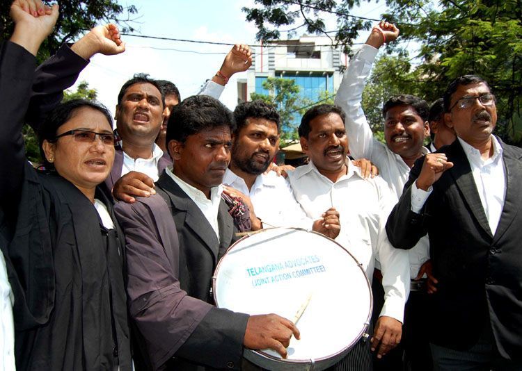 Telangana advocates staging Rasta Roko and eating lunch on road near AP High Court on Monday demanding statehood for Telangana - INN Photos