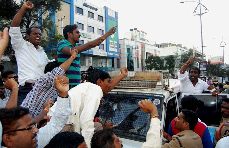 Telangana activists damaging the car of Vijayawada MP Lagdapati Rajagopal at Jubilee Hills police station. The police towed the car while the MP was still seated in it - INN Photos