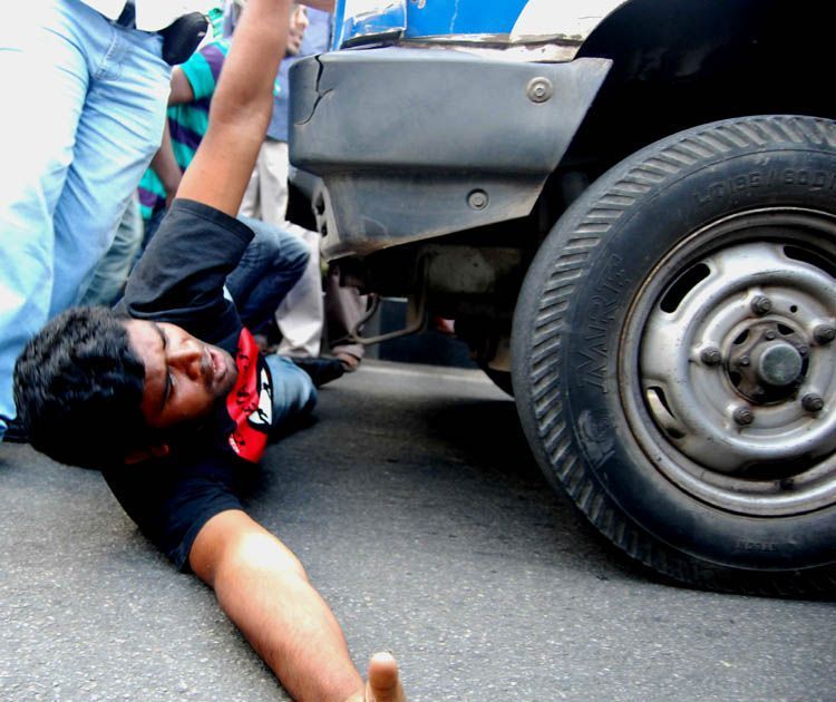 Telangana activists damaging the car of Vijayawada MP Lagdapati Rajagopal at Jubilee Hills police station. The police towed the car while the MP was still seated in it - INN Photos