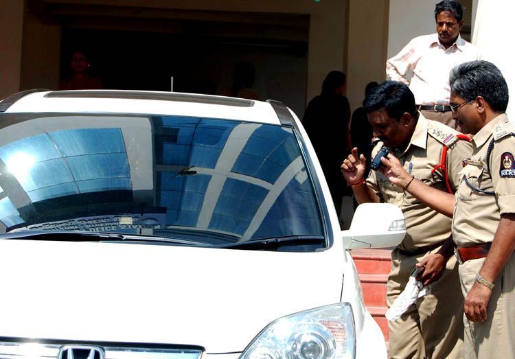 Telangana activists damaging the car of Vijayawada MP Lagdapati Rajagopal at Jubilee Hills police station. The police towed the car while the MP was still seated in it - INN Photos