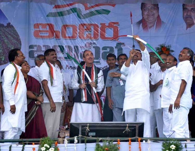 Chief Minister Kiran Kumar Reddy, In-Charge of AP Congress affairs Ghulam Nabi Azad, PCC president Botsa Satyanarayana at the inauguration of Indira Jala Prabha scheme at Yerragondapalem in Prasakasam district on Sunday.