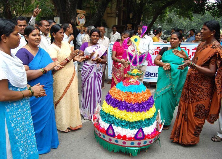 Secretariat Telangana employees playing Batukamma on Monday demanding the announcement of Telangana state formation immediately -INN Photos
