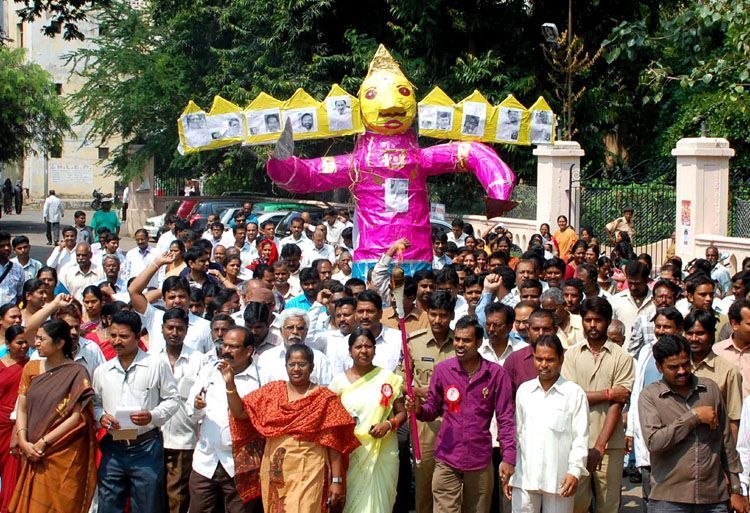 Secretariat Telangana employees playing Batukamma on Monday demanding the announcement of Telangana state formation immediately -INN PhotosOsmania General Hospital Telangana doctors and Employees burn effigy looking like Ravan with ten heads with photo's of Chief Minister and other MLA's who are opposing Telangana statehood at OGH premises in Hyderabad - INN Photos