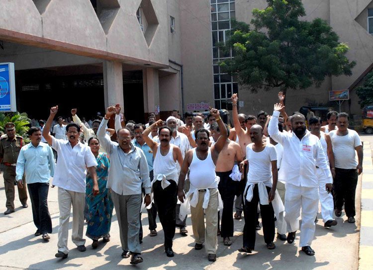 RTC drivers protests by taking out their shirts at MG Bus Depot on Monday demanding statehood for Telangana region - INN Photos
