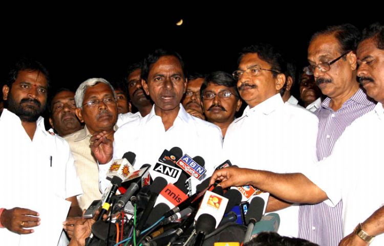 Telangana delegation, comprising MPs MLAs, MLCs and Convenors of various JACs under the leadership of K.Chandrasekhar Rao addressing the press persons after meeting Prime Minister Dr.Manmohan Singh at his residence in New Delhi on Monday.