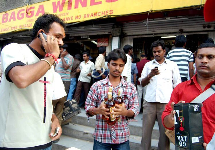 Rush at wine shops on Wednesday due to both - Dasara festival and excise employees joining the general strike for separate Telangana - INN Photos