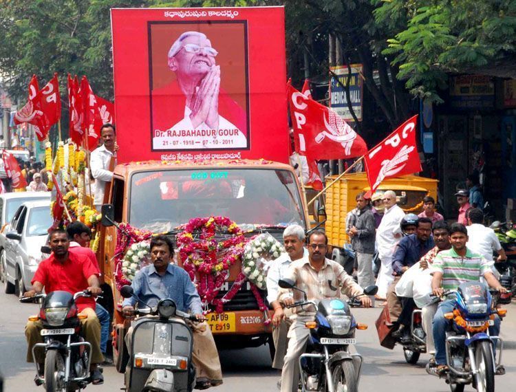 Fulfilling his wish, Vetaran communist leader Comrade Dr Raj Bahadur Gaur's body taken in a procession to Osmania General Hospital from Maqdoom Bhawan in Himayat Nagar. Dr Gaur wills that his body after his death be donated to Osmania Medical college for research purpose - INN Photos