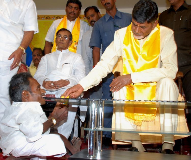 Telugu Desam party chief N.Chandrababu Naidu being greeted by a physically challenged party worker at a party meeting in Eluru on Thursday. Naidu is presently on West Godavari district tour.