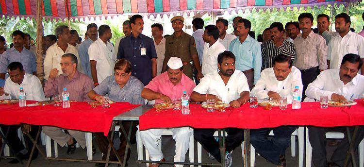 Luncheon diplomacy: Secretariat Telangana employees JAC hosts a lunch for Seemandhra and Telangana employees here on Friday. Although the Employees JAC leaders boycotted the talks on Friday with the government, but they shared lunch with Chief secretatry Pankaj Dwivedi and other senior officials. JAC leaders Swamy Goud and Srinivas Goud are also seen - INN Photos