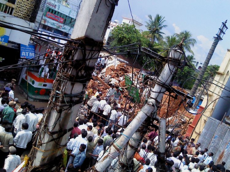 Gali Gopuram of Bhavanarayana Swamy temple in Bapatla in Guntur district collapsed on Sunday around noon. Former Endowment Minister Gade Venkata Reddy on Sunday held Archaeology Department responsible for the collapse. Photos by Sthanam Bharadwaj.