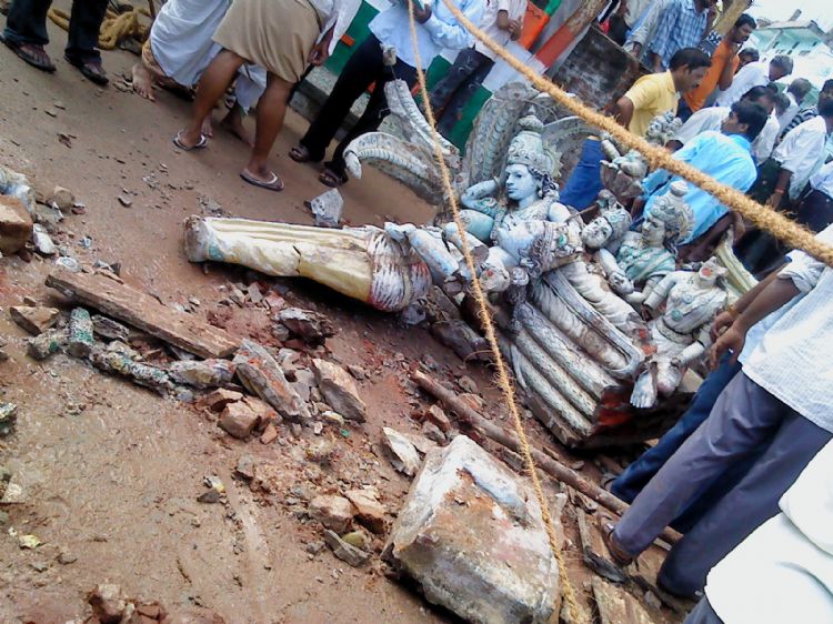 Gali Gopuram of Bhavanarayana Swamy temple in Bapatla in Guntur district collapsed on Sunday around noon. Former Endowment Minister Gade Venkata Reddy on Sunday held Archaeology Department responsible for the collapse. Photos by Sthanam Bharadwaj.