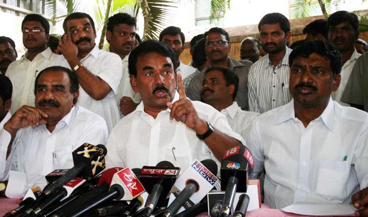 MLAs- Jupally Krishna Rao, S Satyanarayana and T Rajaiah addressing a press conference here on Sunday announcing their resignations from the Congress party. - INN Photos