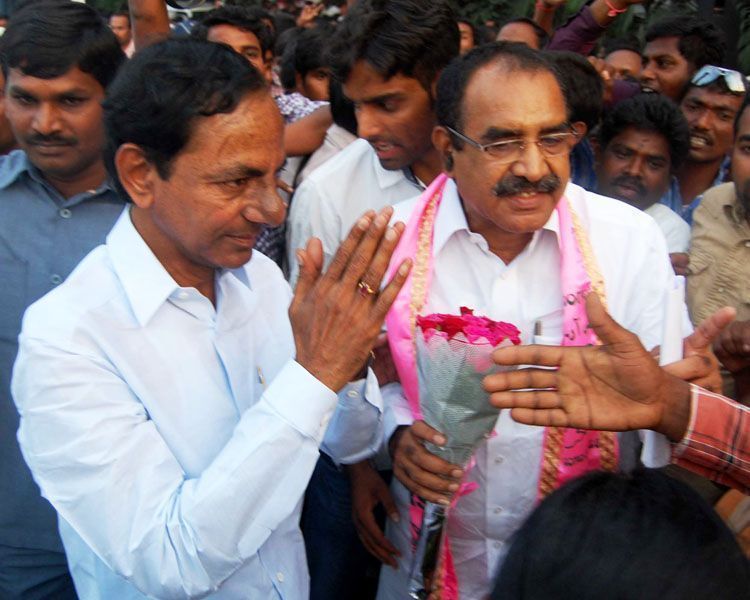 Telangana Congress MLAs being given a grand reception at Telangana Bhavan after they resigned from the party to join TRS here on Sunday - INN Photos