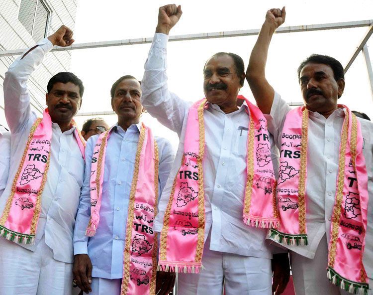 Telangana Congress MLAs being given a grand reception at Telangana Bhavan after they resigned from the party to join TRS here on Sunday - INN Photos