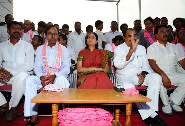 TRS president K Chandrasekhar Rao addressing party workers after three Congress MLAs joined the TRS at Telangana Bhavan here on Sunday - INN Photos