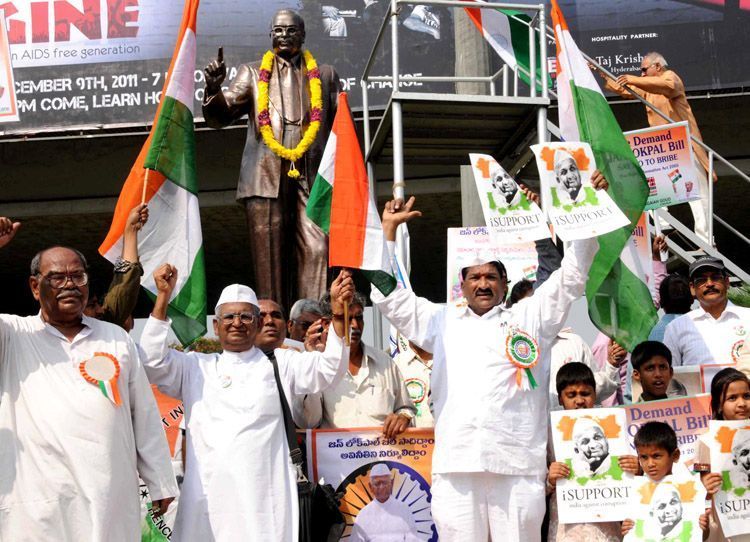 Retired army personnel and children demonstrate in front of Dr BR Ambedkar's statue at Tank Bund on Sunday expressing solidarity with anti-corruption crusader Anna Hazare - INN Photos