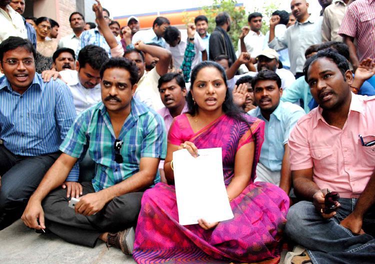 Telangana Jagruti president Kavita along with candidates staging dharna at the APPSC Office at Nampally demanding cancellation of Group-I main examination results. - INN Photos