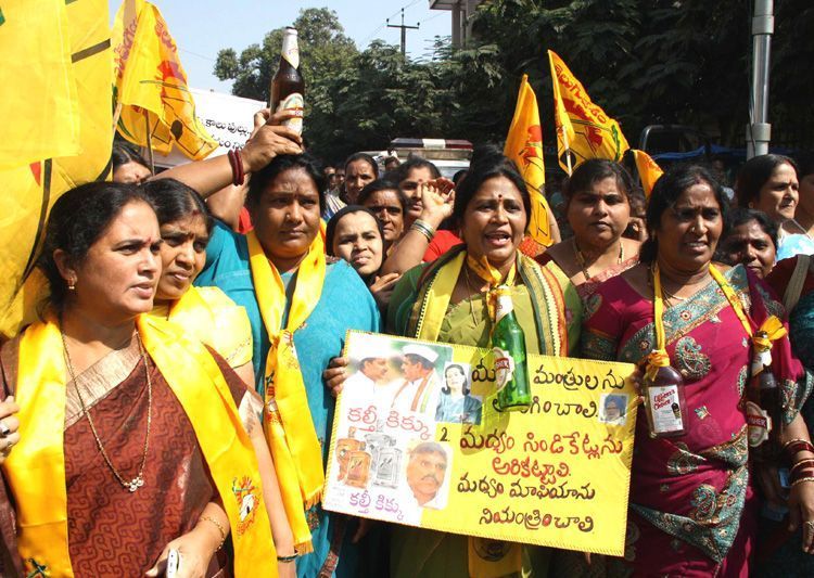 Telugu Mahila activists protest against the liquor mafia before the Excise Department Office at Abkari Bhavan in Nampally here on Tuesday - INN Photos
