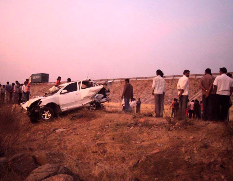 The mangled remains of the ill fated car in which former minister Komatireddy Venkat Reddy's son Prateek Reddy and his friends met with a fatal accident on Outer Ring Road at Kollur near Patancheru on Tuesday.