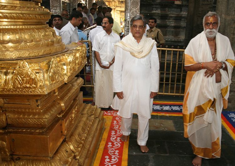 Minister for External Affairs S.M.Krishna accompanied by his wife visited Sri Vari Temple, Tirumala on Friday morning. After darsan of lord veda pandits of the temple have blessed him at Ranganayakula Mandapam. TTD Chairman K.Bapi Raju and other officials also present.