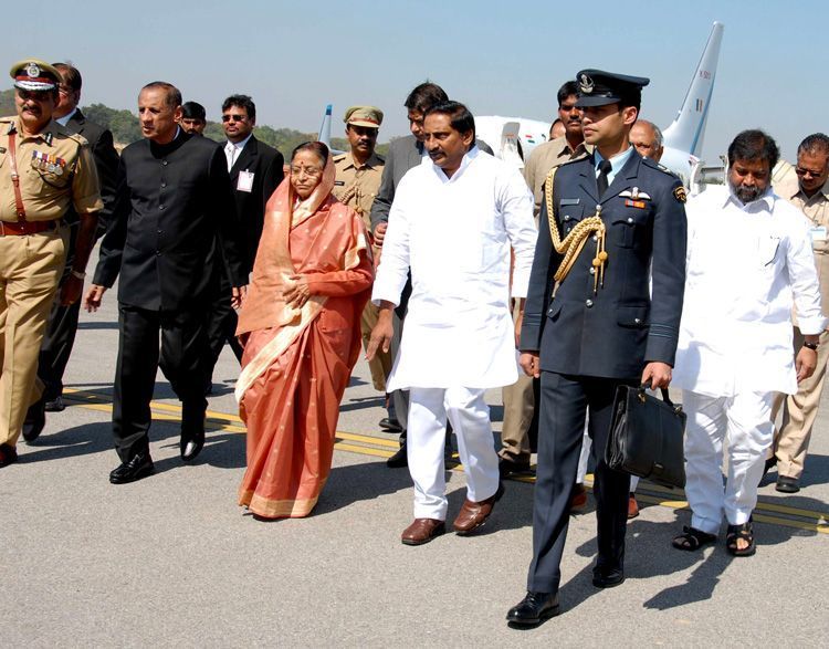 President Smt Pratibha Devsingh Patil being received by Governor ESL Narasimhan, Chief Minister N.Kiran Kumar Reddy, Deputy CM D.Rajanarasimha on her arrival at the Begumpet airport here on Sunday - INN Photos
