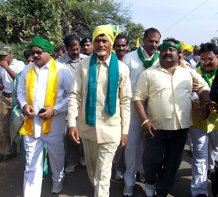 TDP president N.Chandrababu Naidu interacting with farmers who lost crops during his Rythu Porubata padayatra in Karimnagar district on Tuesday.