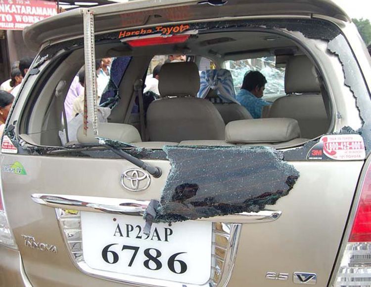 Police break open the rear windshield of a vehicle in Naidu's convoy after TRS activists complains that the vehicle is carrying lathis and sickles on Firday at Jangaon.