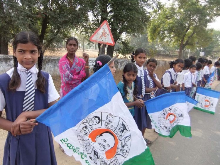 Students of a school at Vegunta in Medak district waiting to welcome YSR Congress president YS Jaganmohan Reddy on Tuesday