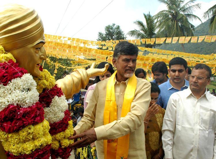 TDP president N.Chandrababu Naidu unveiling the statue of the party founder NT Rama Rao at his native village of Naravaripalle.