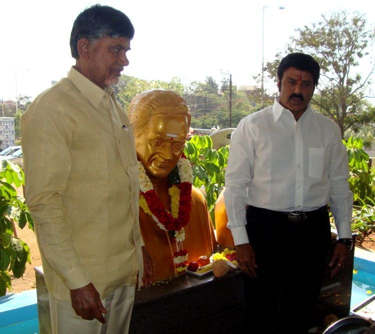 TDP president Nara Chandra Babu Naidu along with Nandamuri Bala Krishna paying floral tributes to NT Rama Rao on his 16th death anniversary at Basavatarakam Indo American Cancer Hospital in Banjara Hills on Wednesday.