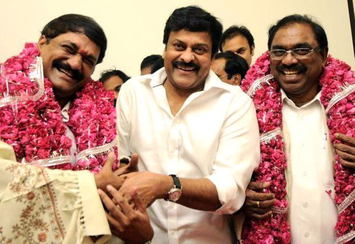 Praja Rajyam president K. Chiranjeevi felicitating party leaders Ganta Srinivasa Rao and C. Ramachandraiah after they were inducted into the cabinet, in Hyderabad on Thursday.