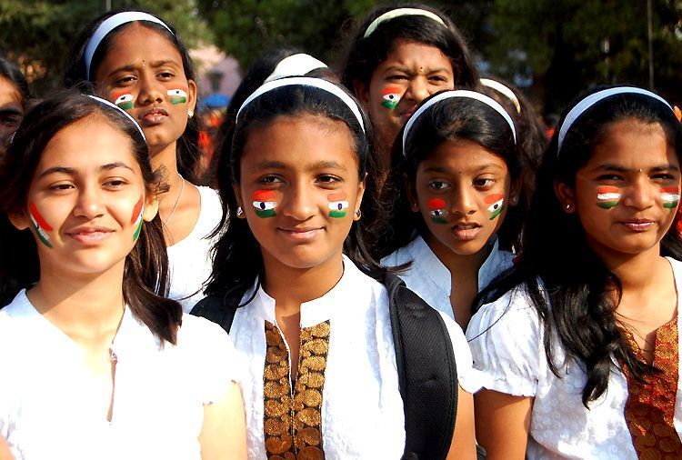 School girls paint their cheeks with tri color falg on the eve of Republic Day celebrations on Thursday.