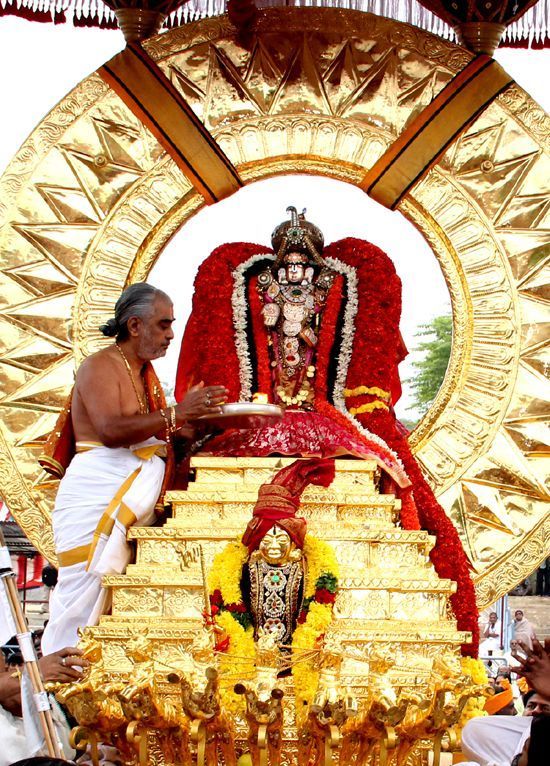 Processional deity of Lord Malayappaswamy taken out in procession around four mada streets at Tirumala in connection with Radhasapthami festival. The Malayappaswamy waited in south mada street till sun rays fall on him.