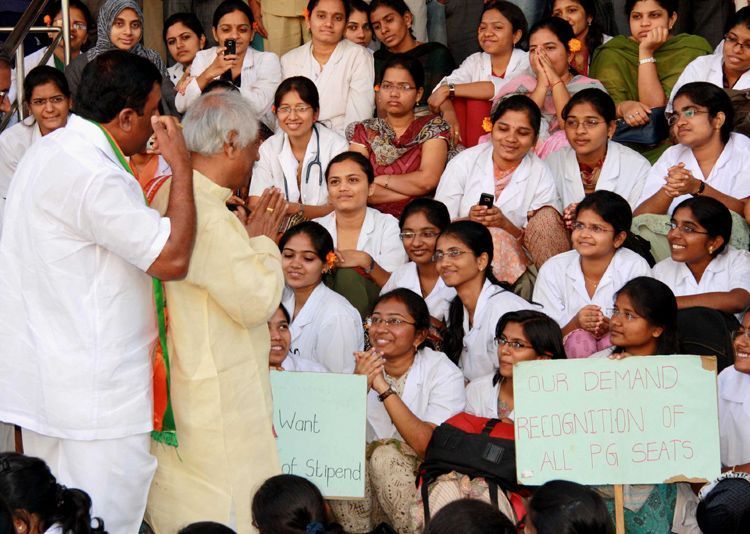 BJP leader Bandaru Dattatreya visiting striking Junior Doctors at Gandhi Hospital here on Tuesday.