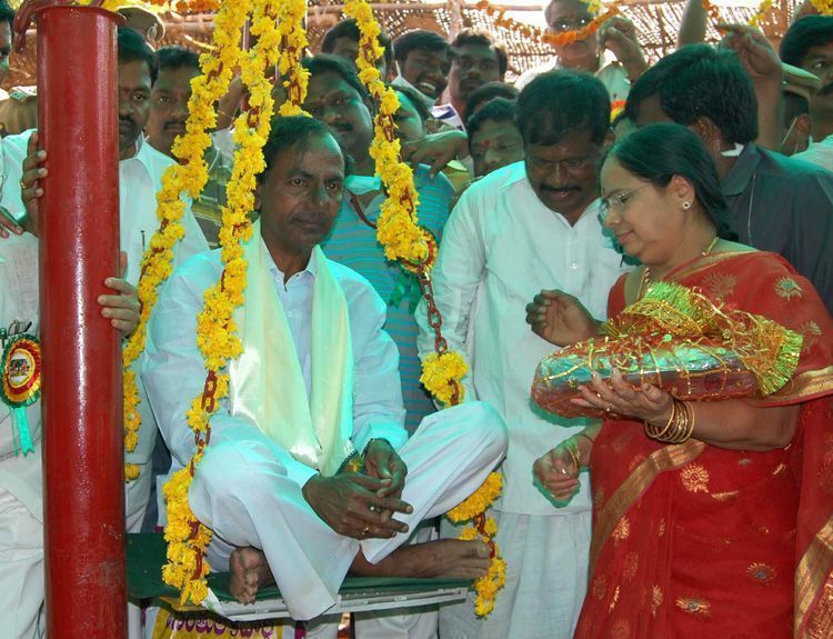 TRS president K Chandrasekhar Rao offered 48 kg of jaggery along with turmeric and vermilion and worshipped the deities of Sammakka and Saralamma at the gaddelu along with his wife in Medaram on Thursday.
