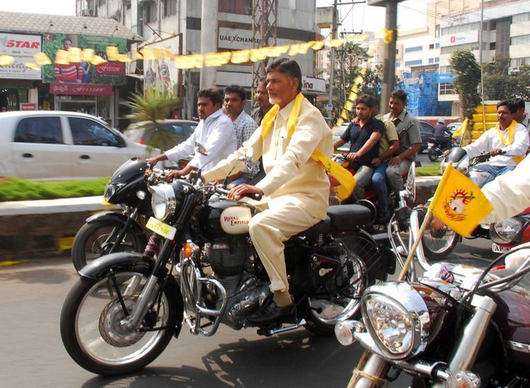 TDP chief N Chandrababu Naidu rides a bike during a bike rally conducted as part of Yuva Tarangalu programme here on Saturday - INN Photos