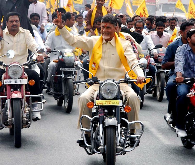TDP chief N Chandrababu Naidu rides a bike during a bike rally conducted as part of Yuva Tarangalu programme here on Saturday - INN Photos