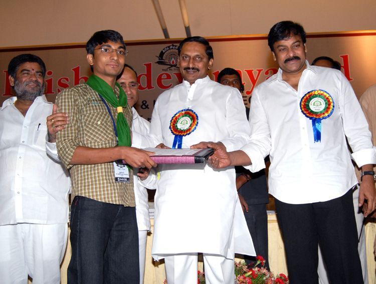 Chief Minister N.Kiran Kumar Reddy, Congress MLA K.Chiranjeevi, Industrialist Tulasi Ramachandra Prabhu are presenting scholarships to poor and talented students on behalf of Krishnadevaraya Aid for Poor and Underprivileged at a function held in Hyderabad on Saturday.