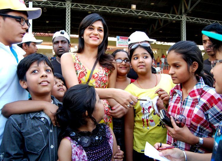 Actress Shradha Das interacts with children at LB Stadium during a cricket match organised by 9 Gems, The Helping Hand, here on Sunday - INN Photos