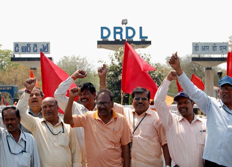 Members of All India Defence Employees Federation staging dharna infront of DRDL here on Tuesday as part of nation-wide general strike - INN Photos