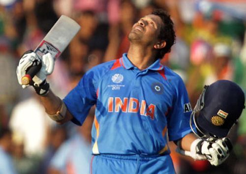 Sachin Tendulkar celebrates scoring his 100th century during the Asia Cup cricket match against Bangladesh in Dhaka, Bangladesh, Friday.