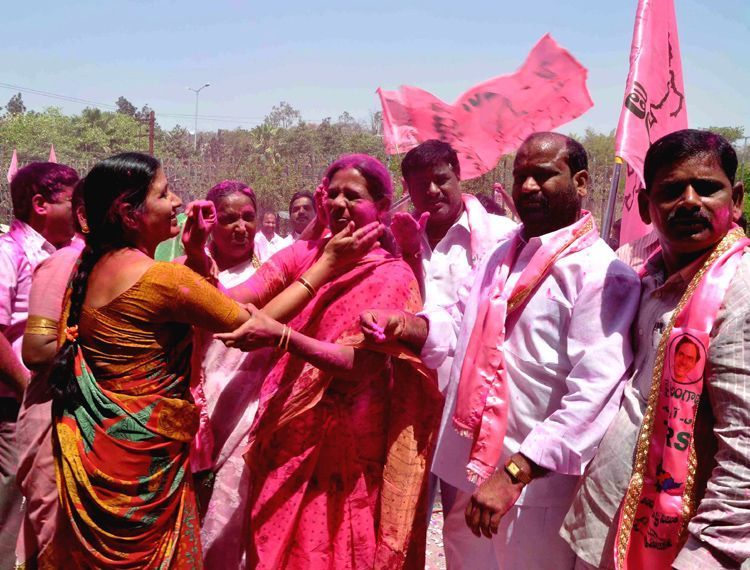 TRS activists celebrate party's victory in by-elections at Telangana Bhavan here on Wednesday - INN Photos