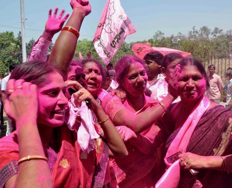 TRS activists celebrate party's victory in by-elections at Telangana Bhavan here on Wednesday - INN Photos