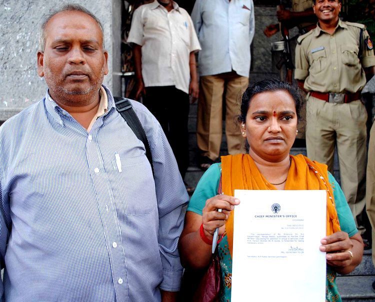 A job aspirant Ms B Karuna climbed atop APPSC Building at Nampally on Saturday threatening to commit suicide over the Commission's failure to sent her appointment letter - INN Photos