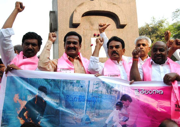 Pro-Telangana MLAs protest before the Telangana Martyrs' Memorial at Gun Park here on Monday in protest against Bhojya Naik's suicide in Warangal demanding statehood for the region - INN Photos