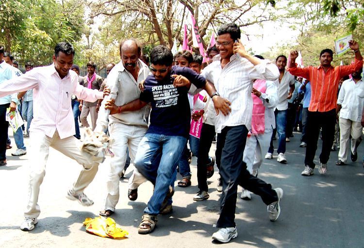 Police prevents TRS activists from desecrating NTR statue during a rally from Sundaraiah Vignana Kendram to Indira Park here on Friday - INN Photos