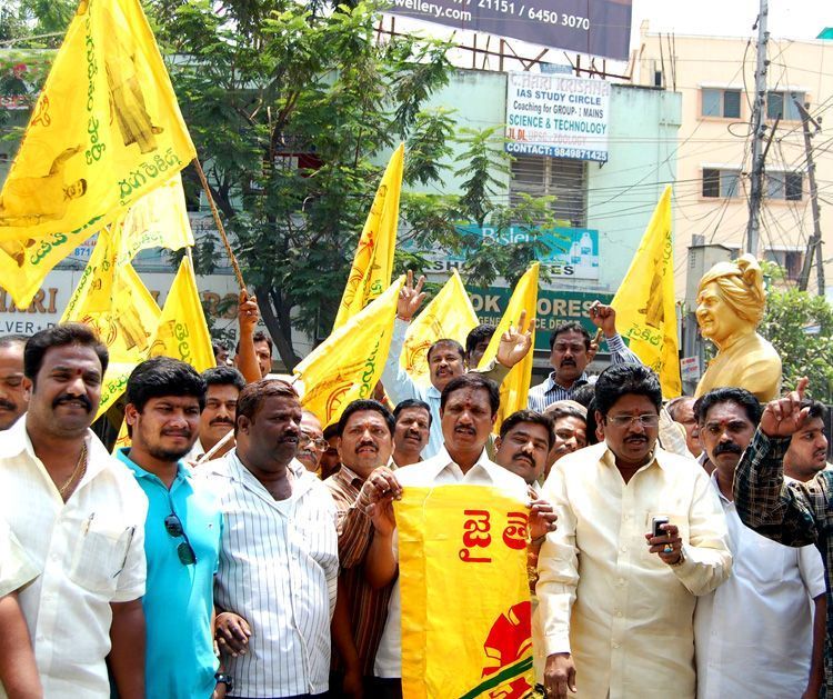 TDP activists stage protest against the attempt by TRS workers to desecrate NTR Statue here on Friday - INN Photos