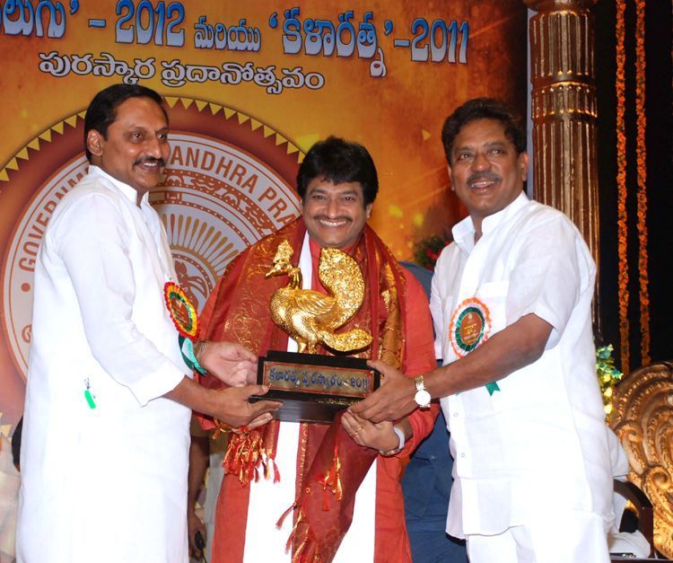 Dr Ghazal Srinivas receiving the prestigious Kala Ratna award from the hands of Chief Minister Kiran Kumar Reddy and Minister for Tourism and Culture Vatti Vasanta Kumar at a grand function held in Ravindra Bharati on Friday.